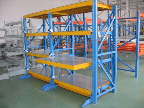 模具货架采用重型货架做为整体框架,在货架柱片上安装导向轨、抽屉盘。一般立柱需用不低于90×70立柱。