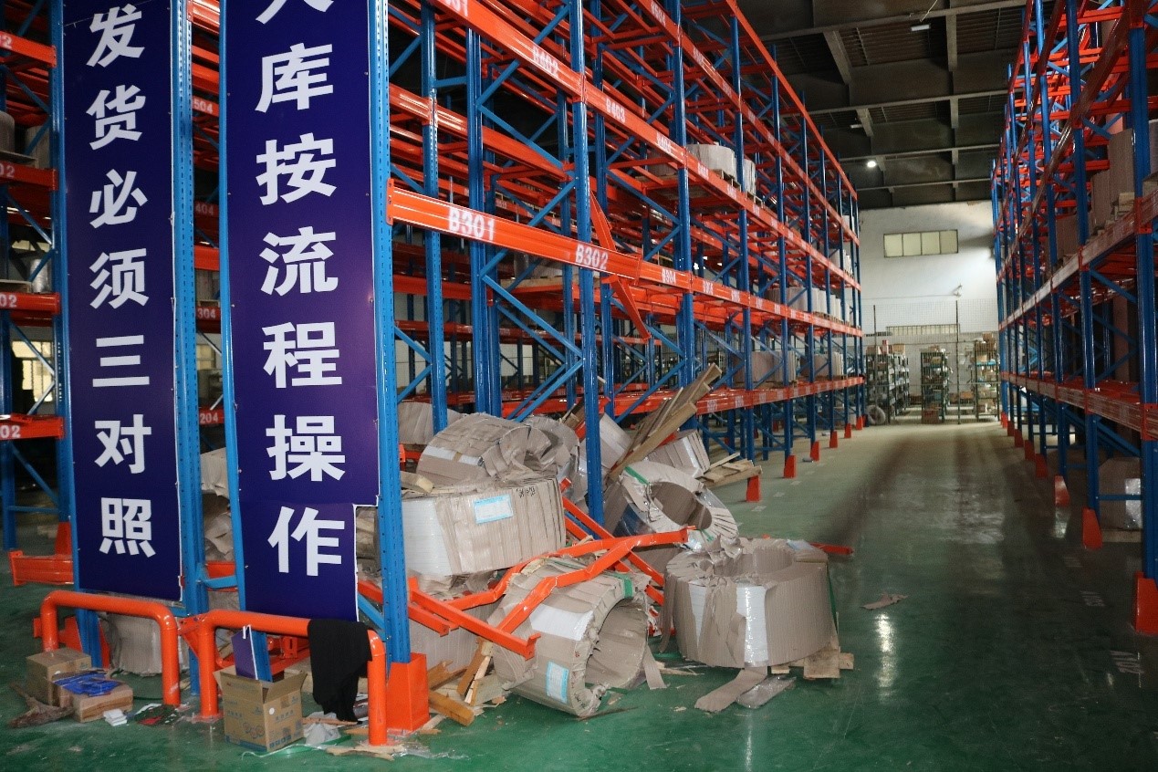 下图是精密材料有限公司成品库内的一重型货架突然塌落现场照片