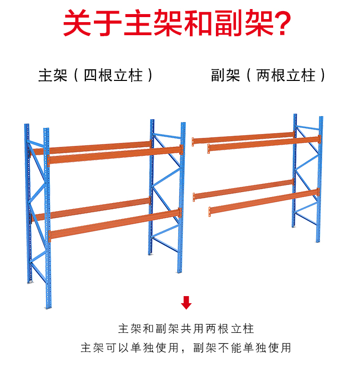 主架指一个完整的货架,而副架与主架的区别就在于副架缺少了部分立柱组成。